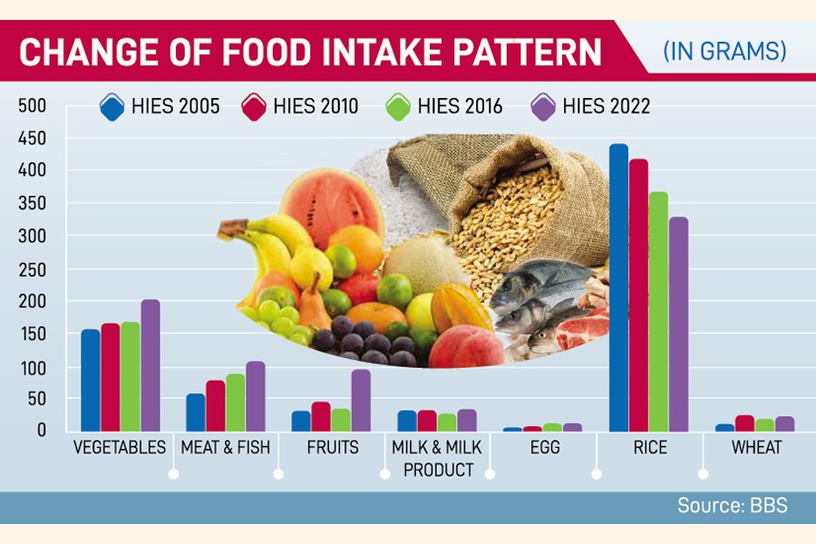 Once in 2005, the per capita rice consumption per day was 439.6 grams, which fell to 416 grams in 2010, 367.2 grams in 2016, and plunged to 328.9 grams in 2022, as per the BBS's HIES survey.