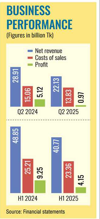 The company's net revenue for the quarter declined to Tk 22.13 billion, over 23 per cent down from Tk 28.91 billion in the corresponding quarter of 2024.