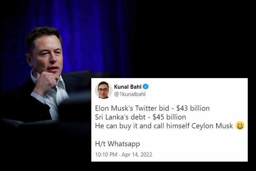 Bahl wrote a WhatsApp viral on Twitter in which he said that Elon Musk's Twitter bid is $43 billion and Sri Lanka's debt is $45 billion. "He can buy it and call himself Ceylon Musk," Bahl wrote with a laughing emoji. Ceylon is Sri Lanka's other name.
