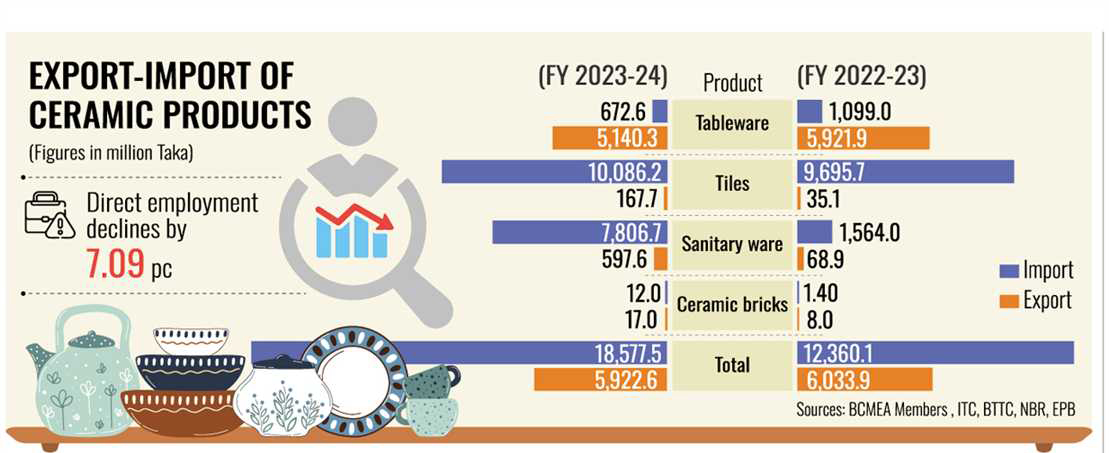 The ceramic sector in Bangladesh, despite its impressive growth in recent years, faced a setback in the fiscal year 2023-24, as there was a decline in both exports and direct employment compared to the previous year.