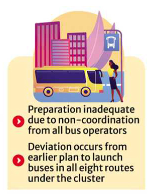 The government is set to launch air conditioned (AC) bus service on one route of the green cluster today (Tuesday) again without adequate preparation due to non-coordination from all bus operators, deviating from its earlier plan to launch buses in all eight routes under the cluster.