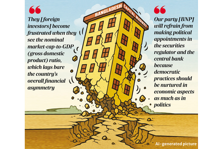 Mr Khosru said a large number of big foreign portfolio investors, including Bangladeshi immigrants, were keen on investing in the country's capital market. "But they become frustrated when they see the nominal market-cap-to-GDP (gross domestic product) ratio which lays bare the country's overall financial asymmetry."