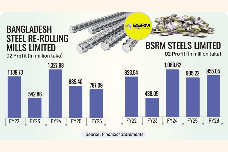 Steel maker BSRM Steels secured a 5.5 per cent year-on-year increase in profit to Tk 955.05 million in the second quarter of FY26, whereas Bangladesh Steel Re-Rolling Mills reported an 11.1 per cent year-on-year decline in earnings to Tk 787.1 million in the same quarter.