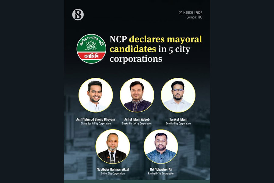 For other city corporations, Advocate Tarikul Islam, Convener of NCP Jubo Shakti, has been nominated for Cumilla City Corporation; Advocate Md Abdur Rahman Afzal, Convener of Sylhet NCP, for Sylhet City Corporation; and Md Mobasswer Ali, Convener of Rajshahi NCP, for Rajshahi City Corporation.