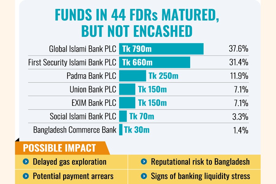 State-owned energy corporation Bangladesh Oil, Gas and Mineral Corporation (Petrobangla) is facing mounting challenges in recovering Tk 2.10 billion placed as fixed deposits in seven troubled private and scheduled banks, raising concerns over funding for key gas-development projects.