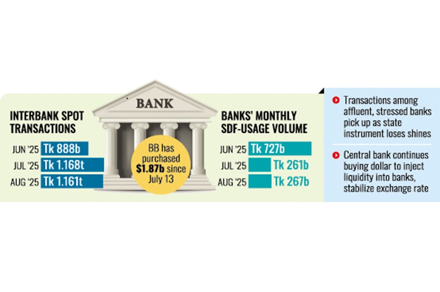 In July and August last, the data showed, the monthly volume of interbank spot transactions rose to Tk 1.16 trillion and Tk 1.16 trillion while monthly SDF-usage volume was recorded at Tk 261 billion and Tk 267 billion respectively.