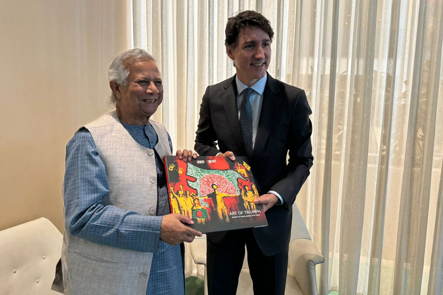 Chief Adviser Professor Dr Muhammad Yunus on Tuesday handed over ‘The Art of Triumph’, an art book on the wall paintings of the Bangladeshi students painted during after the student-people revolution, to Canadian Prime Minister Justin Trudeau.