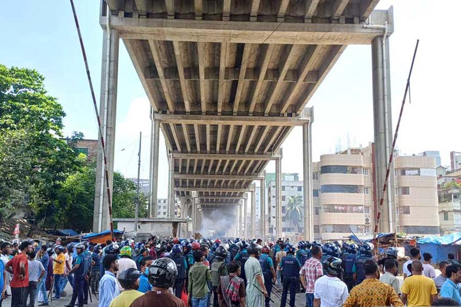 Traffic on the Dhaka-Chattogram highway has been halted due to blockades at Shanir Akhra and Matuail Road. Protesters and police are clashing near BRAC University.