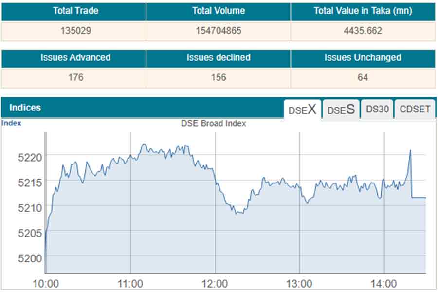 DSEX, the prime index of the Dhaka Stock Exchange (DSE), increased 12.75 points to settle at 5,211.53.
