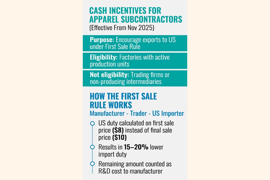 The government has decided to provide cash incentives to subcontracting apparel and textiles makers to help boost their exports to the USA market under the 'US first sale rule'.