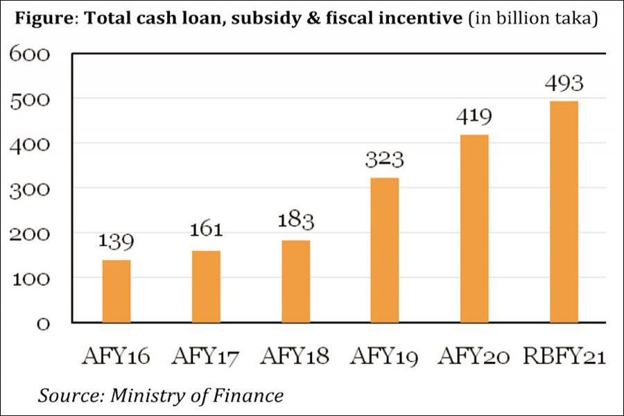 The subsidy management has emerged as a challenging area from the perspective of the broader fiscal management as Bangladesh embarks on the post-Covid 19 recovery phase. Subsidy, as is known, is provided in many forms: cash loan support and fiscal incentives to different sectors including agriculture, export, jute goods, power and energy. Over the years, the total subsidy budget has been on the rise, from Tk 139.24 billion in FY16 to Tk 493.30 billion in FY21 - an increase of 50.8 per cent per year. The highest amount is spent on fiscal incentives served to different sectors (56.2 per cent in FY21), followed by cash loans for BPDB, BPC and BJMC (30.4 per cent) and subsidies for food and gas & others (13.3 per cent in FY21).