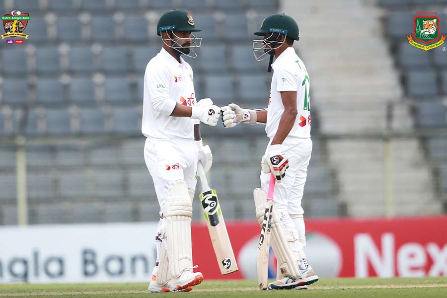 On the stroke of the lunch, Kumara got the wicket of Liton Das after tormenting him repeatedly. Liton who scored 25 off 43 with four boundaries and added 41 runs with Taijul was bowled out after a fuller delivery of Kumara nipped back.