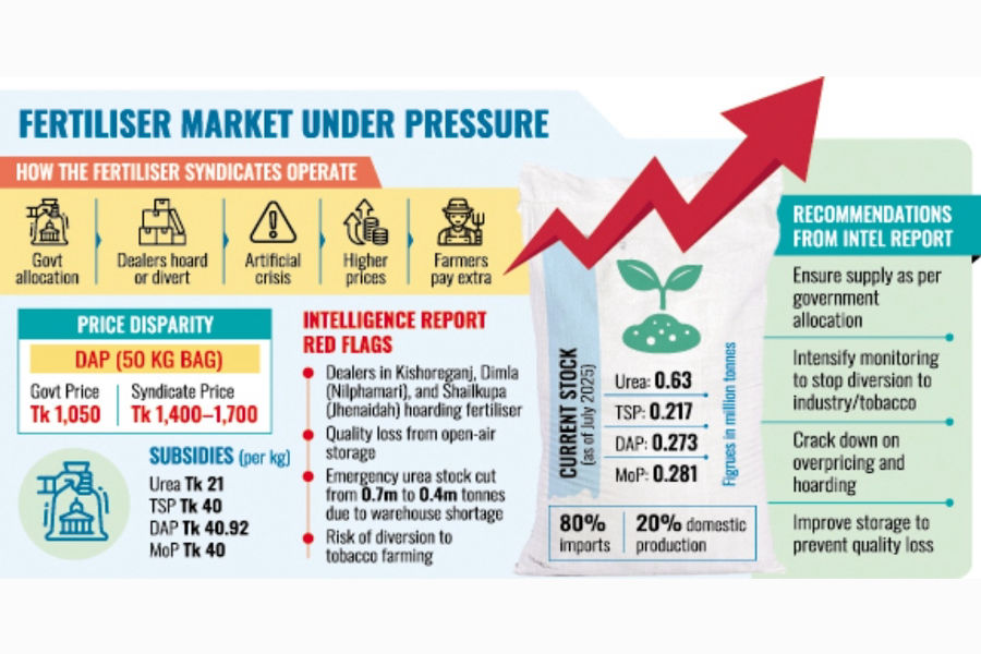 As of July in FY 2025-26, stocks stand at 0.63 million tonnes of urea, 0.217 million tonnes of TSP, 0.273 million tonnes of DAP, and 0.281 million tonnes of MoP-- enough to meet demand for the next three months, according to BADC and BCIC.