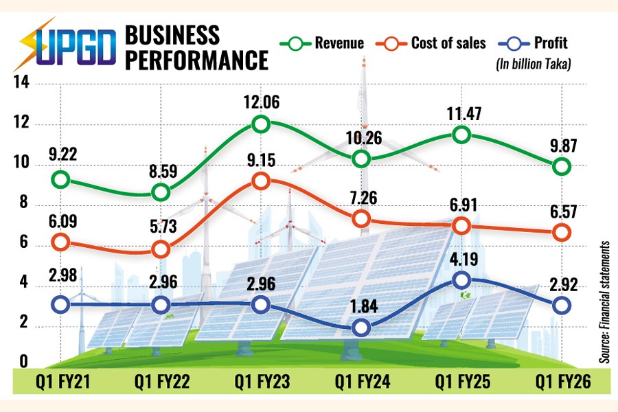 After reporting its highest-ever annual profit in FY25, United Power Generation & Distribution Company's first-quarter profit plunged 30 per cent year-on-year to Tk 2.92 billion in the three months to September, due to lower revenue and higher production costs.