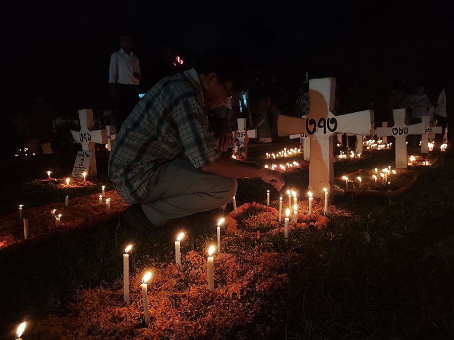 The smell of incense sticks rose water, and flowers mingled with the scent of grass burnt by the candle fire. The light of thousands of candles illuminates rows of graves.