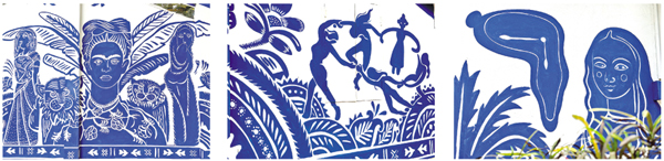 A large mural displayed portraits of Frida Kahlo, Leonardo da Vinci's Mona Lisa, a revised Michelangelo's David where Shubho Noboborsho written on his chest, Salvador Dali's The Persistence of Memory, and Henri Matisse's The Dance. It boldly stated that art knows no boundaries and can speak across cultures and continents.