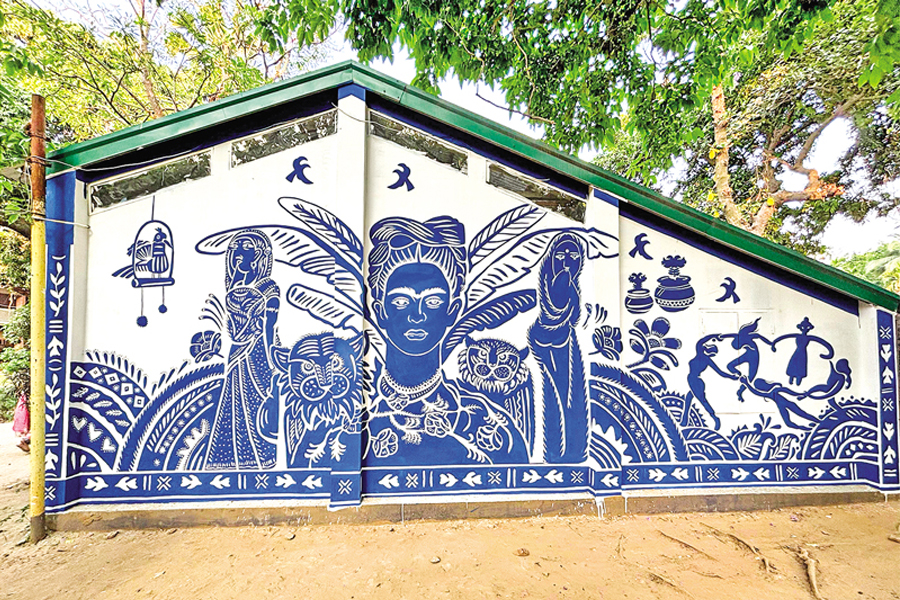 As is tradition every year, Charukola organised and operated the day-long event. However, this year, visitors noticed something different. The artwork surrounding the school building fused East and West. Alongside alpana designs and Bengali folk motifs were towering portraits and reproductions of famous European art pieces.