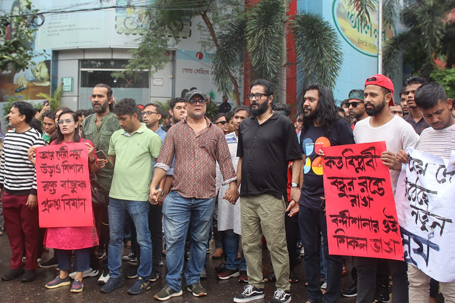First gathered at Rabindra Shorobor in Dhanmondi, the artists, under the banner of ‘Get Up Stand Up’, then marched towards the Central Shaheed Minar, joining thousands of protesters.