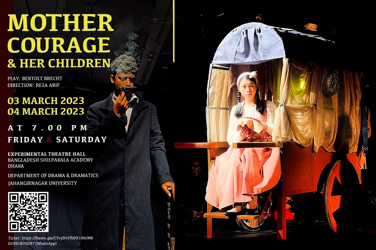 Mother Courage and Her Children, a play written by German playwright and poet Bertolt Brecht, in the context of 'Thirty Years' War', which is one of the longest and most destructive wars in European history, took place in Central Europe from 1618 to 1648, causing the death of around 4.5 to 8 million battlers and civilians, while more than 50 per cent of the population decreased in the area that is now modern Germany, will be performed on March 3rd and 4th at the Bangladesh Shilpakala Academy.