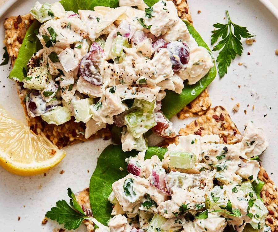 It is very nutritious and high in protein. It contains skinless boiled chicken breast, sliced almonds, chopped tarragon, chopped parsley, lemon juice, and salt and pepper.