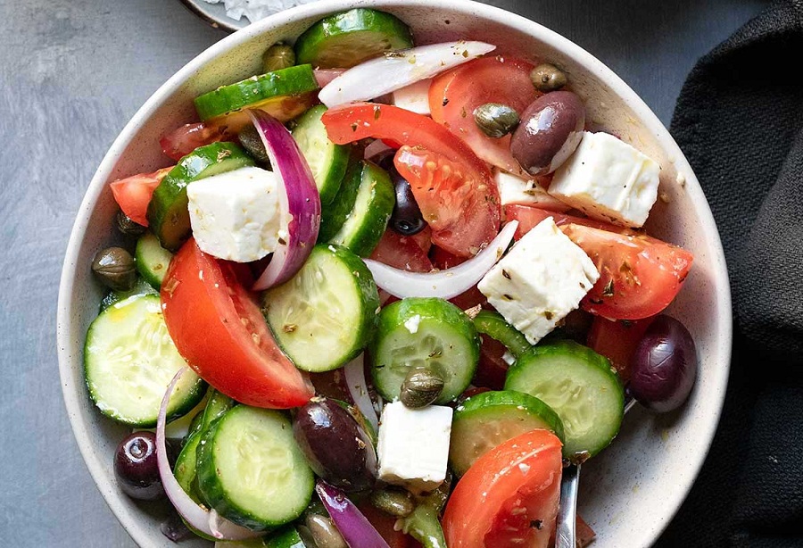 Known by another name, horiatiki salad, it comes from Greece. It is made with cucumber, red onion, green bell pepper, half-grape tomatoes, chopped Kalamata olives, crumbled feta cheese, salt, and pepper. Add minced garlic, vinegar, lemon juice, olive oil, and Dijon mustard to make a dressing.