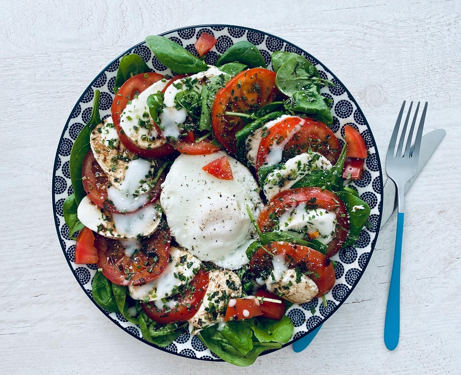 Sliced tomatoes, fresh mozzarella, sweet basil, salt, and olive oil are the ingredients of the traditional Italian Salad known as Caprese. This salad matches the colours of the Italian flag, and the white and green tones are also in this Salad.