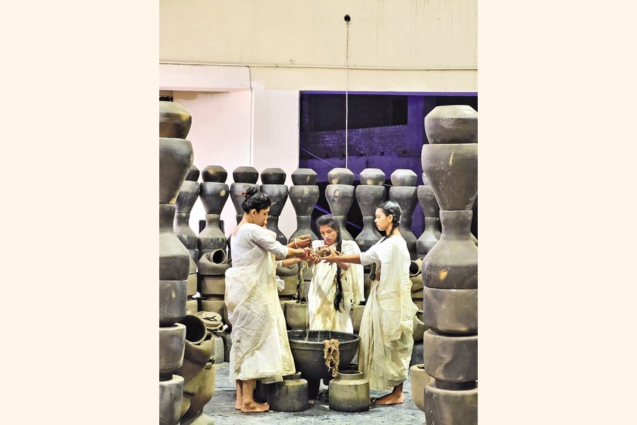 "See the theme (subtitle) of this year's event," the elderly man then indulged in a little conversation, "It's 'Bonna' (flood), indicating many things like the women of our country, gender sensitivity, natural disaster, etc. I can relate the whole exhibition through this theme."