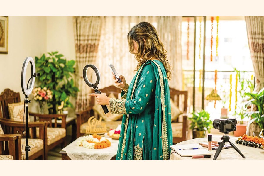 Shaila Amzad, a youngster in her twenties, barely has time to catch her breath after returning from an afternoon of Eid shopping. Dropping her bags on the bed, she quickly sets up her ring light and positions her iPhone on a tripod. Before unpacking her new outfits, she needs to film something first - an 'Eid shopping vlog' for Instagram.