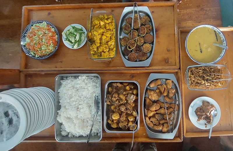 Main courses included delicious beef, mutton, fried Paisa fish, BBQ chicken or Cobra fish etc. The extra peppery dry chilli with smashed onions and mustard oil trapped us into non-stop eating. And the vegetables were on another level.