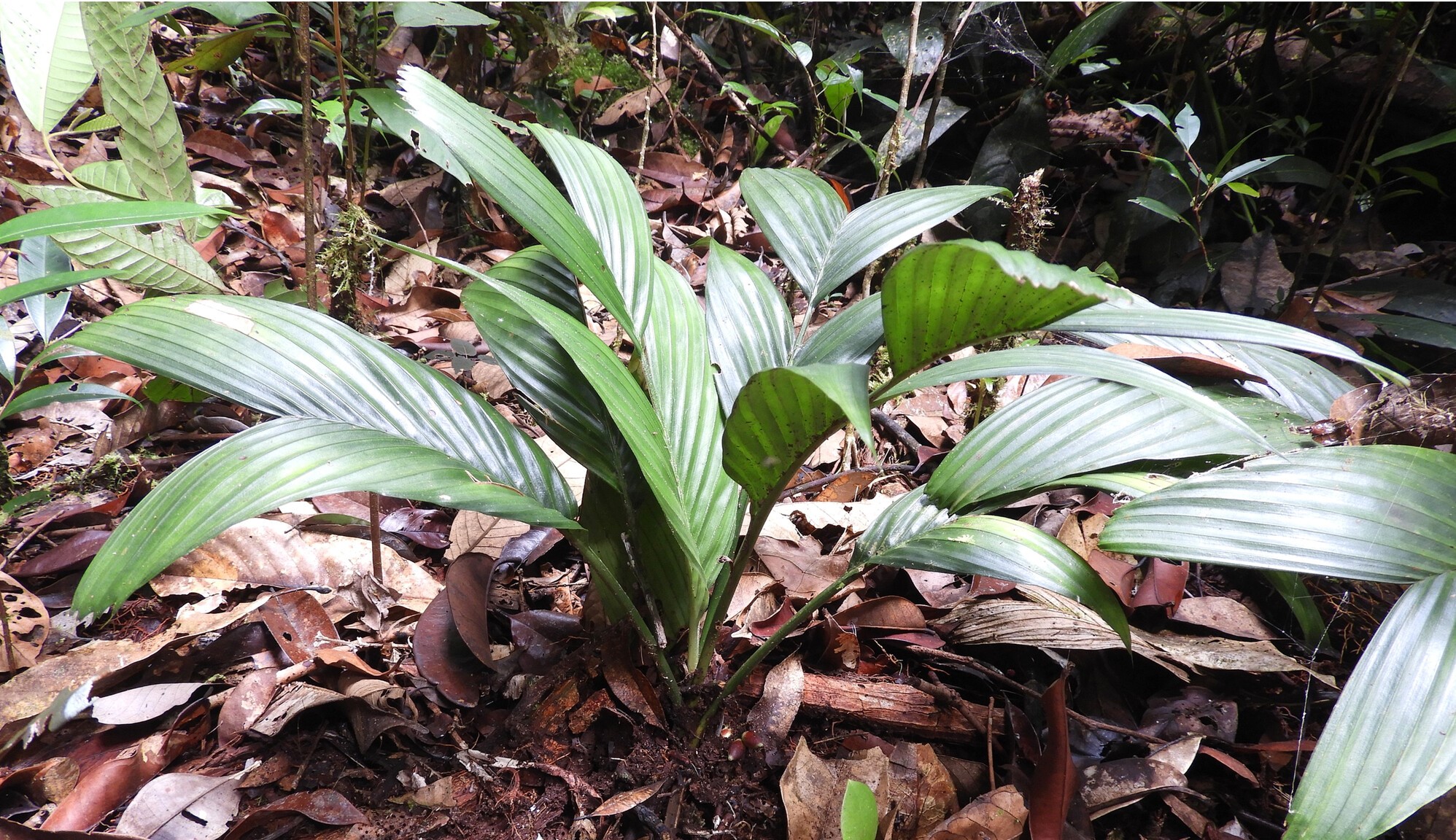 Firstly, the stem of Pinanga subterranea exhibits saxophone growth, bending downwards before curving back upwards, facilitating its underground presence. Secondly, the formation of funnel-shaped leaves allows organic litter to accumulate, providing a conducive environment for root growth beneath the forest floor. Lastly, the compact clusters of flowers develop entirely underground, hidden from sight yet crucial for the palm's reproductive cycle.