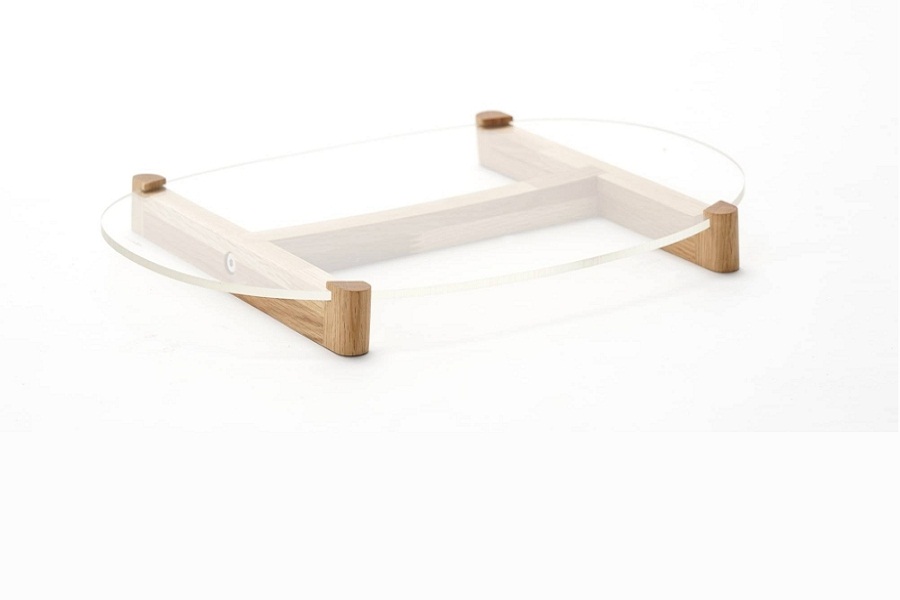 One of the standout pieces from this collaboration is the tray designed by Keiji Ashikawa. This unique piece features a recycled oak base and a plane window pane at its top. The minimalist design showcases the beauty of the repurposed acrylic and recycled wood and retains the original shape of the plane window, giving you a piece of aviation history in your home.