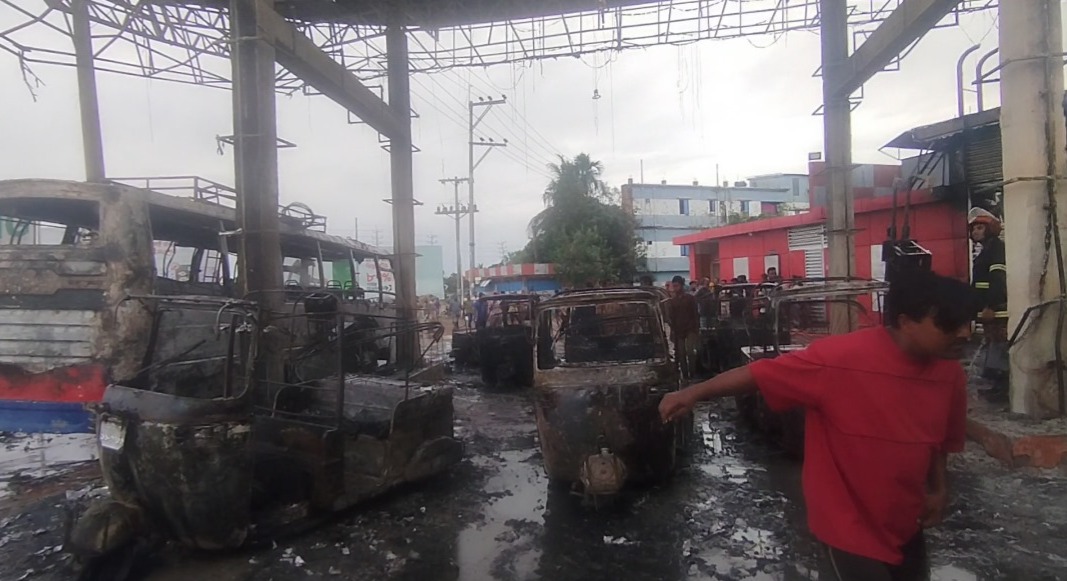 At least nine CNG-run autorickshaws and one passenger bus were burnt in an explosion at a refueling station in Nabiganj upazila of Habiganj district early Thursday.