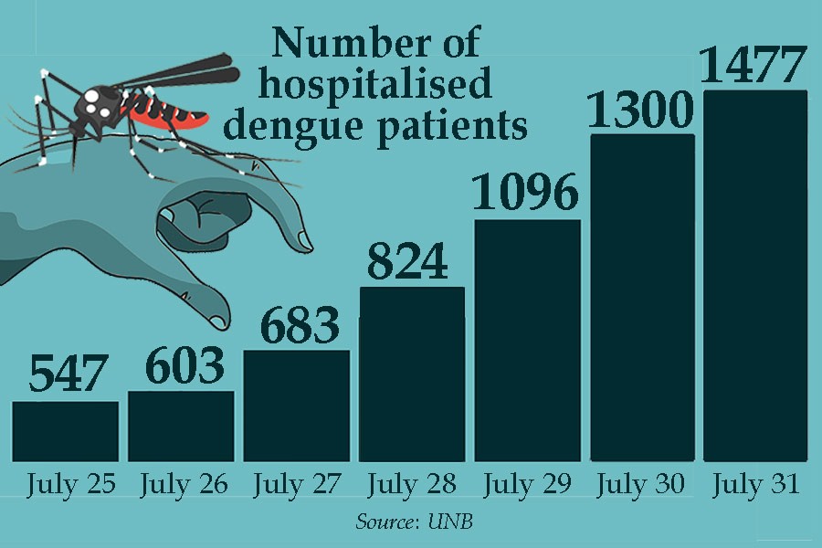The number of dengue patients continued to rise as a total of 1,477 more people infected with the mosquito-borne fever were hospitalised across the country in the last 24 hours till 8am on Wednesday.