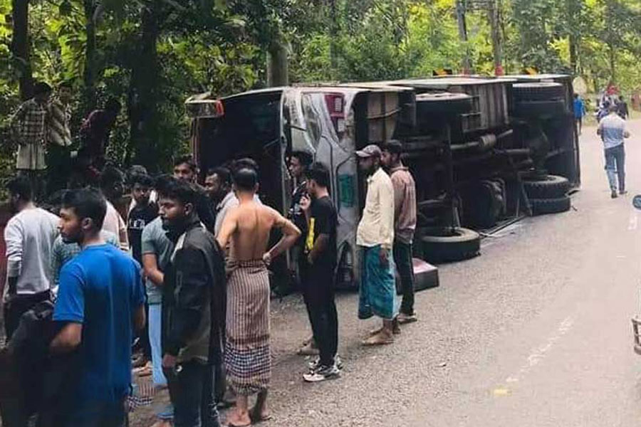 The bus veered out of control and overturned as it reached the Bir Srestha Munshi Abdur Rouf Square area at the entrance to Manikchari town on Friday morning, said Md Shahed Uddin, chief of the Kotwali Police Station.