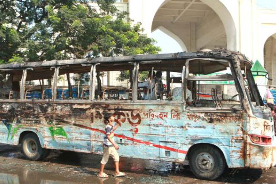 According to the press release, 41 cases of fire were reported in Dhaka division, 1 in Rajshahi division, 2 in Khulna division, and 1 in Rangpur division. A total of 19 buses, 3 microbuses, 3 ambulances, 1 truck, 7 motorcycles, 3 pickups, and 1 CNG were burnt.