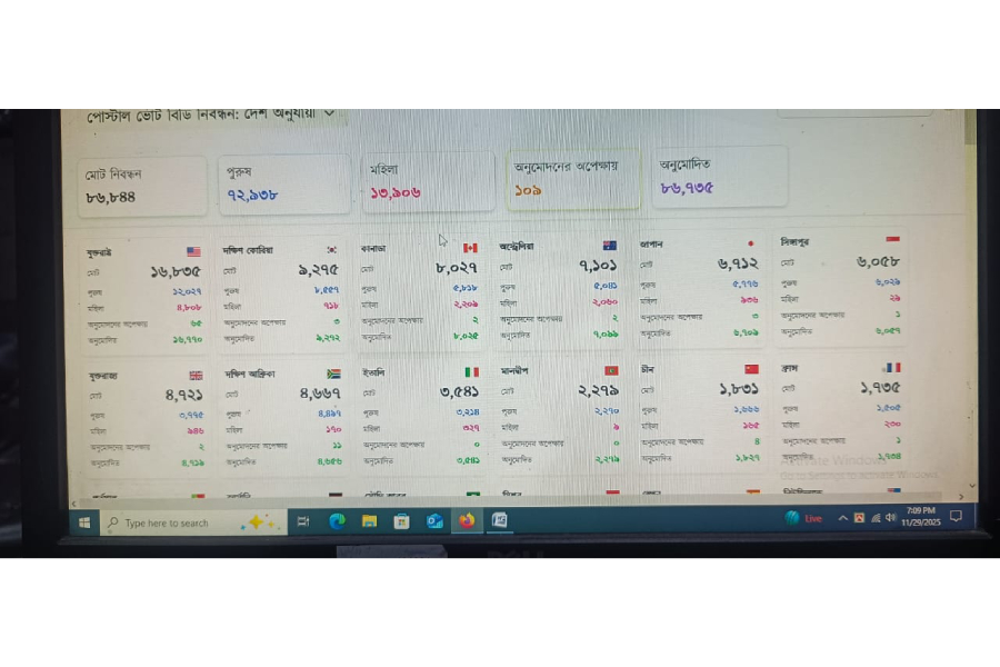 The Election Commission (EC) on November 19 opened the ‘Postal Vote Bd’ app initially for 53 countries and then for a total of 143 countries, UNB reports.