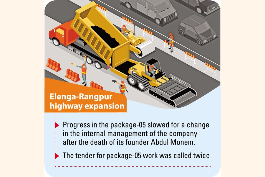Sources said Abdul Monem Limited, which was picked for building 28 kilometre of the 190-km Elenga-Hatikumrul-Rangpur highway under package 05, which takes an unusual delay in the work for a couple of months.