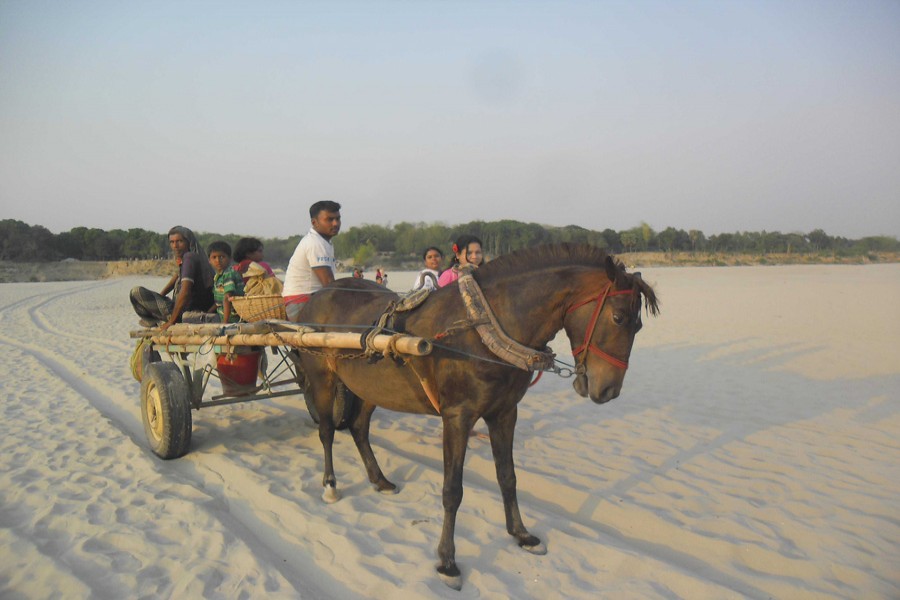 A horse-drawn carriage crossing through a dried-up river bed in Magura. — FE Photo