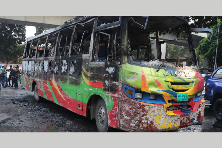 Unidentified miscreants set a bus on fire at Tantibazar intersection in Old Dhaka on Wednesday night amid the countrywide 48-hour blockade enforced by BNP and like-minded opposition parties.