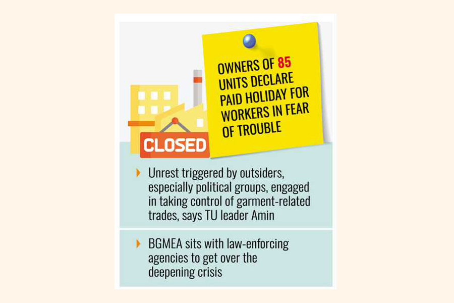 They also claimed that big groups like Sharmin and Hameem announced holiday on Monday in fear of any untoward incident as they alone have more than 30,000 workers, and "if they come out onto the streets or gather, it would be difficult to manage them and may lead to closure of the adjacent units".