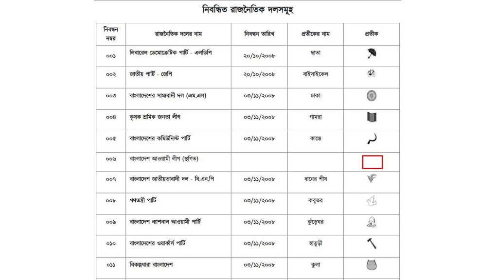 On Wednesday, the sixth entry on the list of party registrations stated “Awami League (registration suspended)”, with the registration date, party symbol and party symbol name boxes left blank. These boxes had previously been filled.