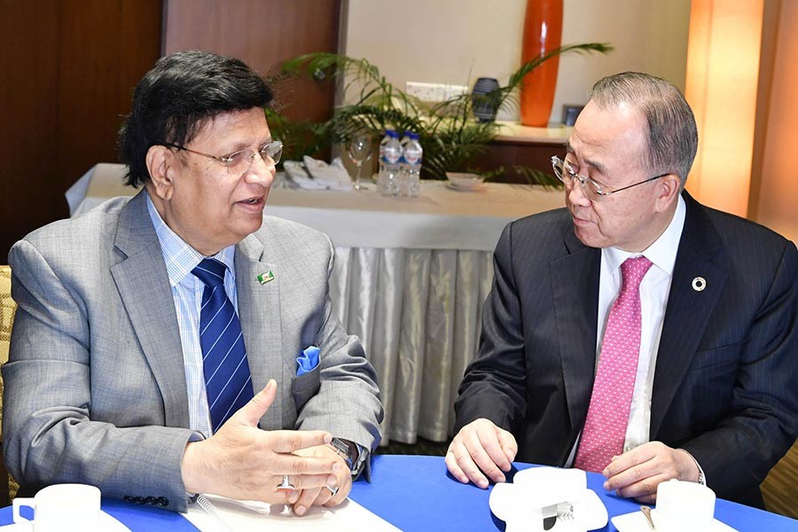 Former UN secretary general Ban Ki-moon talking with Foreign Minister Dr AK Abdul Momen during a meeting at a city hotel on Saturday. -PID Photo