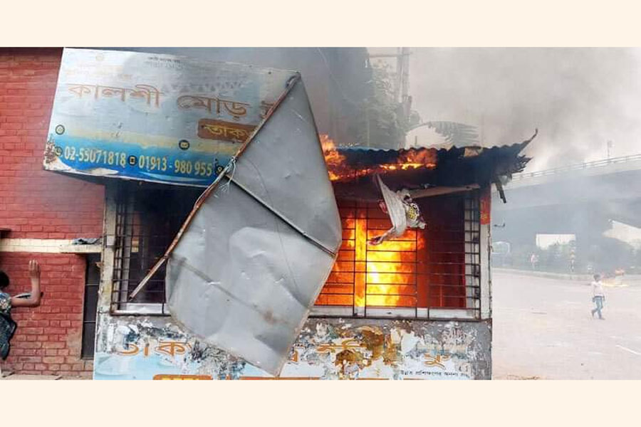 Drivers of battery-run three wheelers set a police box on fire at Kalshi intersection in the city’s Mirpur area on Sunday during demonstration against banning the vehicle on Dhaka streets.