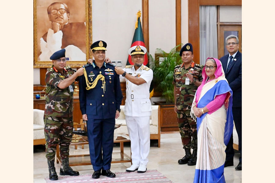 Khan received the new rank badge from Chief of Army Staff General Waker-Uz-Zaman and Chief of Naval Staff Admiral M. Nazmul Hassan in a ceremony at Ganabhaban on Sunday, attended by the Prime Minister.