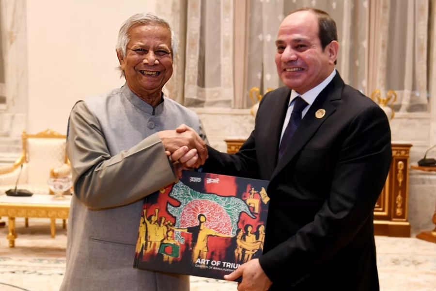 The Chief Adviser gifted a copy of the Art of Triumph, an art book on the wall graffiti and murals of the July mass uprising, to the PLO leader.