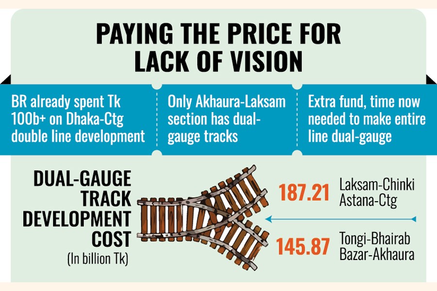 It has already spent over Tk 100 billion on developing double lines on the 321km Dhaka-Chattogram section during the Awami League government's term, instead of laying dual-gauge tracks.