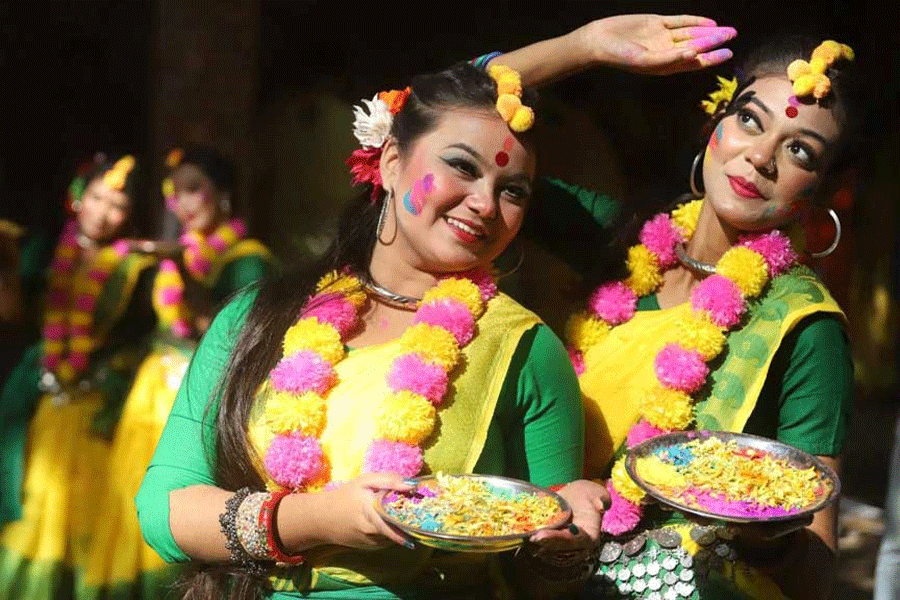 From morning to noon, the venues were filled with dance, music and recitations. Along with performances from cultural groups, various ethnic communities also showcased their traditions, captivating the audience. The event also featured recitations of poems and prose on spring while participants smeared each other with coloured powders, a customary part of the celebration.
