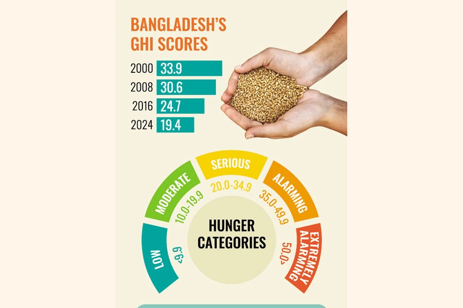 Bangladesh's ranking in the global hunger index (GHI) improved slightly with a score of 19.4 this year, narrowly escaping the category of serious-hunger group.