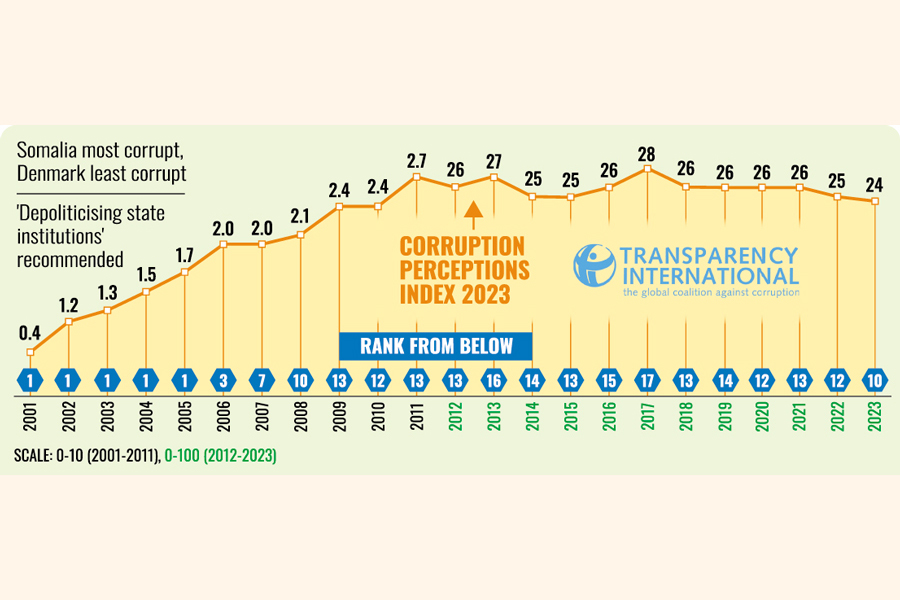 Transparency International Bangladesh (TIB)-the country chapter of the Berlin-Based anti-graft watchdog-revealed this relapse at a press conference at its office in Dhaka on Tuesday, noting that the country's score declined from 26 to 24 out of 100.
