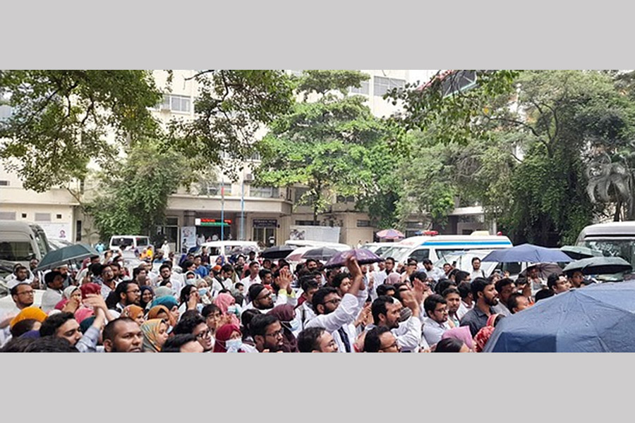 The protesters began staging a sit-in near the Shahgabh intersection at 10 am on Sunday at the behest of the Postgraduate Private Trainee Doctors Association, reports bdnews24.com.